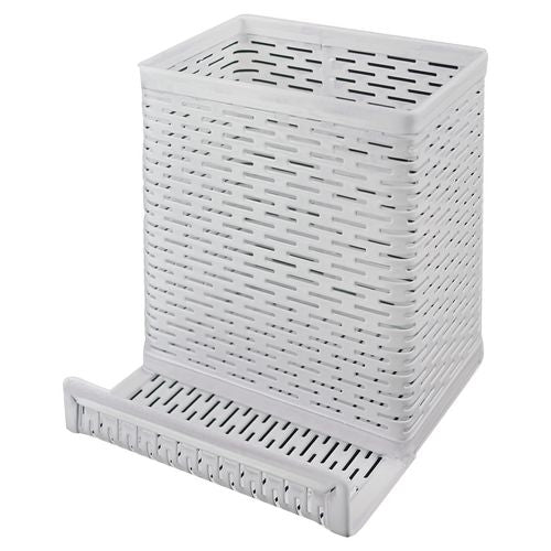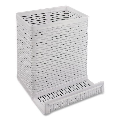 Strong, professional grade punched metal with decorative urban style slotted pattern. High quality satin finish complements any décor. Features protective feet to prevent surface wear and scratches on the desktop surface. Reinforced rounded edges provide durability and attractive detailing. Pencil holder with a convenient place to hold cell phone, keeping it close at hand.