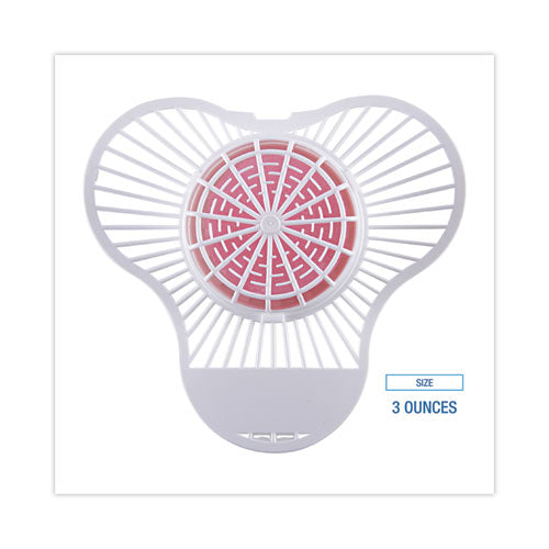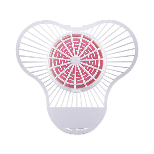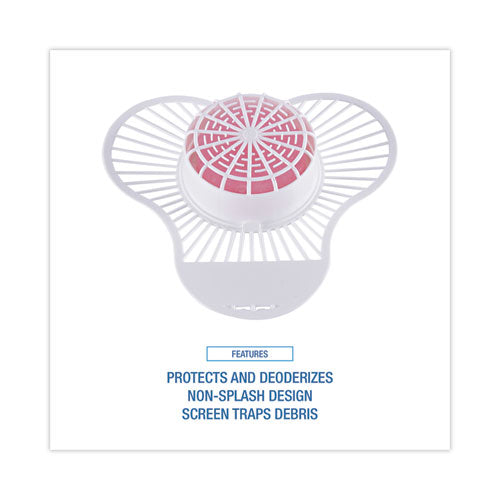 Boardwalk® Urinal Screen with Para Deodorizer Block cleans, protects, sanitizes, and deodorizes to keep the urinal clean and smelling fresh. Constructed with a pliable, plastic screen that helps to traps debris. Reduces odor causing bacteria, which protects the drain. Built with a durable, non-splash design. Para deodorizer kills odor-causing bacteria and disinfects. Lasts up to 30 days with a cherry scent.