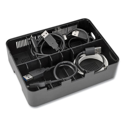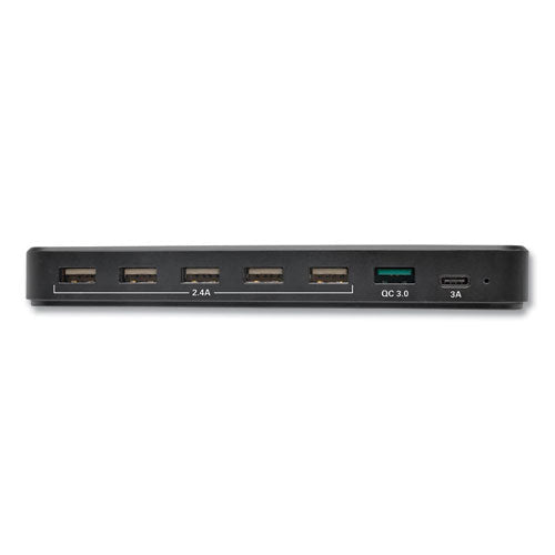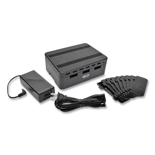 Whether you're at home or in the office, the 7-Port USB Charging Station provides enough ports and power to keep your devices at 100% capacity. No more peering behind furniture to find an available outlet or unplugging one device to charge another. You can charge up to seven tablets, smartphones and other devices at the same time. The charging station doesn't require a computer, so you can take it anywhere AC power is available. It features five USB-A ports, each capable of delivering up to 5 V, 2.4 A, which is enough for charging even battery-intensive devices. The USB-C port provides up to 5 V, 3 A for more powerful devices. Plus, a Quick Charge 3.0 port is capable of rapid-charging compliant devices up to four times faster than normal USB charging. In addition, this charging station doubles as a storage unit by providing space to neatly organize cabling while your devices charge. When not in use, cables can be stored in the compartment and kept out of the way. The included adjustable brackets accommodate the number and size of the devices being charged. To charge your USB devices, simply connect the five-foot power cord's NEMA 1-15P plug to an AC power outlet and connect your devices to the available USB ports. The unit protects against overheating, overcurrent and overcharging—in fact, it stops charging as soon as your devices' batteries are at full capacity. Also, each USB-A port complies with USB Battery Charging (BC) specification v1.2. The brackets and power supply store conveniently in the charging station when not in use.