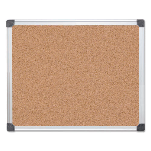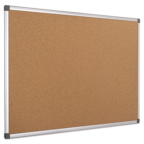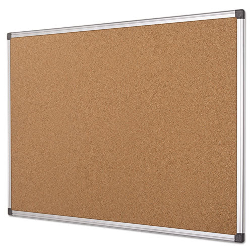 The MasterVision™ Maya Cork Bulletin Board is an economic solution that delivers effective posting and versatility for office and facility communications. Designed for commercial applications, the Maya bulletin board's self-healing surface never shows pin holes and is made from renewable cork; making it both durable and resilient. Framed in sturdy heavy gauge aluminum, it has an easy 4-corner mounting system that can be positioned either vertically or horizontally, offering versatility when reconfiguring a workplace or where wall space is limited.Package Includes: Hanging Hardware; Instructions