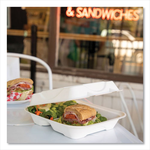 Eco-Products award-winning new line, Vanguard, is a collection of groundbreaking molded fiber clamshell containers. Vanguard products use FDA approved proprietary alternative compounds to achieve grease-resistance performance, without relying on conventional PFAS (Per- and polyfluoroalkyl substances). Made from reclaimed and rapidly renewable sugarcane fibers, this product meets BPI requirements for compostability certification. This recycled, disposable clamshell container is both hot and cold food friendly and microwave safe.Note: This is a non-returnable item.