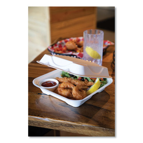 Eco-Products award-winning new line, Vanguard, is a collection of groundbreaking molded fiber clamshell containers. Vanguard products use FDA approved proprietary alternative compounds to achieve grease-resistance performance, without relying on conventional PFAS (Per- and polyfluoroalkyl substances). Made from reclaimed and rapidly renewable sugarcane fibers, this product meets BPI requirements for compostability certification. This recycled, disposable clamshell container is both hot and cold food friendly and microwave safe.