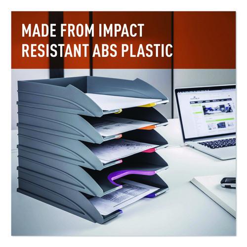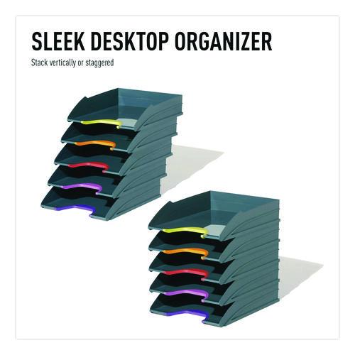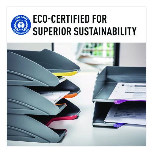 The VARICOLOR® Stackable Letter Tray Set from DURABLE® is a versatile storage solution that streamlines your organization and productivity. The five color-coded trays keep all your essential documents neatly organized, whether it's paperwork, files, mail, brochures, notepads, important documents and more. Maintaining a clutter-free workspace is effortless – simply place it directly on your desktop to ensure essential paperwork is always within reach. For those seeking even greater space optimization, stack multiple units together – they can be stacked either vertically or staggered. Alternatively, seamlessly integrate them into standard office storage cabinets, sideboards, and bookcases for a streamlined and organized workspace. Crafted with premium, long-lasting plastic, VARICOLOR is designed to stand the test of time, making it the perfect solution for high-traffic environments where document handling is frequent. This VARICOLOR Stackable Letter Tray Set is Blue Angel certified. Awarded by the German government, Blue Angel certification ensures that this item meets rigorous criteria for sustainability, health, and performance. By choosing this product, you're supporting responsible manufacturing practices. Each tray has a colorful cut out so you can easily locate and grasp your files. The anti-slip base pads provide stability and protection, preventing slips and desktop scratches. VARICOLOR is the perfect solution for a wide range of environments, ideal for organizing documents in offices, schools, restaurants, hotel front desks, retail stores, banks, hospitals, maintenance offices, legal offices, senior living homes, warehouses, manufacturing, industrial settings, and even at home.