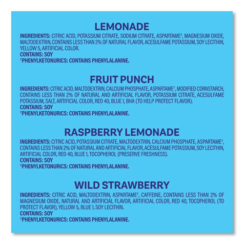 Crystal Light® Variety Pack Drink Mixes are fruity beverages you can enjoy anywhere. With zero grams of sugar and five or ten calories (depending on flavor) per packet, Crystal Light® has 90% fewer calories than leading beverages, so you don't have to choose between taste and calories. Each variety pack includes 15 lemonade, 15 fruit punch, 15 raspberry lemonade and 15 wild strawberry with caffeine drink mixes. The individual packets of powdered drink mix fit easily in your bag, desk, or car, so you can enjoy a refreshing glass of Crystal Light® anywhere. Simply empty one packet from our 60-count box into a bottle of water or a glass with two cups of water, shake or stir, and enjoy!Package Includes: (15) 0.09 oz Fruit Punch; (15) 0.14 oz Lemonade; (15) 0.08 oz Raspberry; (15) 0.11 oz Wild Strawberry with CaffeineNote: This is a non-returnable item.