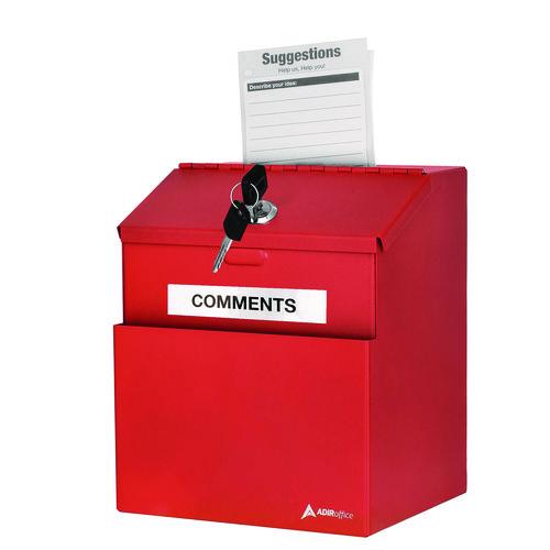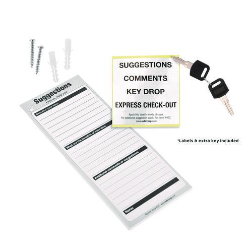Encourage reliable interaction with clients or employees with this lockable steel suggestion box. The lock ensures confidentiality, which inspires your customers and staff to share their opinions and comments honestly. Compact and lightweight, the box can be placed in any easy-to-reach spot or mounted on a wall to save space. Two keys are included with this purchase for quick and easy access inside. The deposit slot is 4.75" length x 0.13" width, making it ideal for dropping off payments, interoffice mail or suggestion cards. Additionally, the opening in the middle is large enough to drop off keys. A front pocket is ideal for holding pens, suggestion cards and small envelopes, allowing for writing suggestions and comments right on the spot. Stick-on labels that dedicate the box for suggestions, comments or for dropping off keys, as well as 25 suggestion cards are also included with this purchase.Package Includes: (2) Keys; (25) Suggestion Cards; Stick on LabelsNote: This is a non-returnable item.