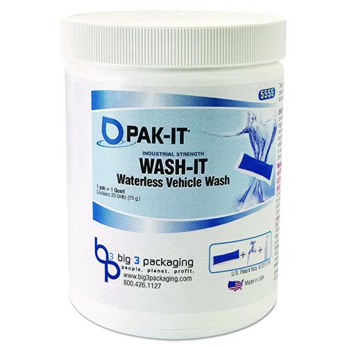 Simply drop one pre-measured dark blue WASH-IT PAK-IT into its matching quart trigger spray bottle (sold separately) and add cold, tepid or warm water. Wait two minutes and shake. Adjust nozzle to mist setting and then just spray and wipe off with a clean microfiber cloth or ideally a paper towel. WASH-IT's formula is safe to use on all interior surfaces yet powerful enough to remove bird droppings, bugs, road tar, dirt and oil from the vehicle's exterior. Ammonia-free. If you don't want to mess with a bucket, hose and sponge then try the quick and easy alternative WASH-IT.