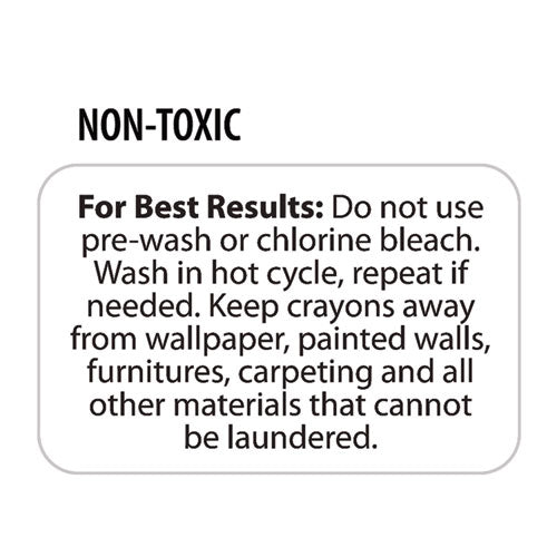 When your little Picasso gets a little carried away with color, these 16 washable colors come in super handy for a quick cleanup. The bold, rich colors easily wash away from skin, clothes and surfaces washable with soap and water. Go ahead, let your fearless artist color outside the lines, in the lines or over lines and express their artistic talent any way they choose. Color on-without worry!
