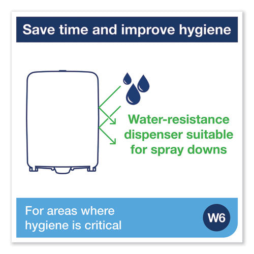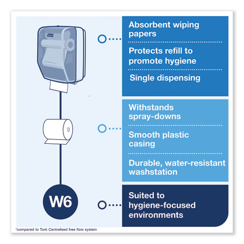 The Tork® Washstation Dispenser in Performance Design is a one-at-a-time paper wiper dispenser that offers a high level water resistance and accommodates a large capacity refill. Designed from the ground up, this dispenser fits seamlessly into your cleaning or HACCP protocols. It's built to withstand wet environments and does not require removal during spray-downs, keeping refills safe and hygienic for every use. And with a smooth, durable, plastic casing, it's easier to maintain and keep clean. Save on cost, labor and waste with a water-tight dispenser that protects refills from spray-downs or in wet areas, all while delivering a stylish impression.
