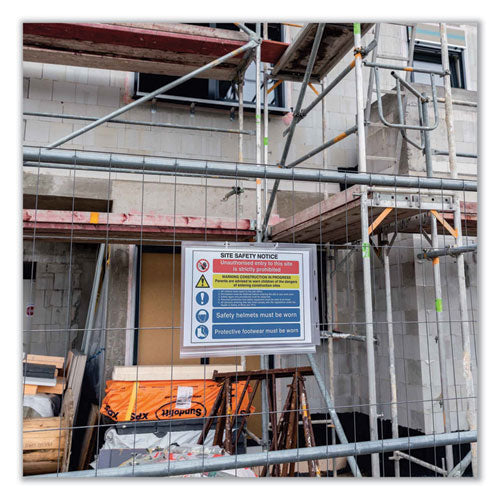 The Cable Tie Water-Resistant Sign Holder from DURABLE® is your go-to solution for professionally displaying signage in outdoor environments exposed to humidity, water, and excessive heat. Easily showcase important information, instantly grabbing attention and effectively conveying your message right where you need it. Its sleek and professional appearance is perfect for displaying notices in pools, saunas, garden centers, and other outdoor or water-exposed environments. Featuring a press-stud closure for reliable document protection, you can ensure your signs remain intact in rain and humid spaces. Keep your messaging up to date in the crystal-clear frame that protects documents from creasing, tearing, or smudging and can be used in portrait or landscape mode. Designed for easy insertion and removal of documents, you can update promotions, announcements, safety information, or directional signage without any hassle, keeping your signage fresh, relevant, and engaging. The IPX5 water-resistant rating, combined with zipper technology, ensures reliable protection against sprays from all directions, prolonging the product's lifespan. Additionally, the high-quality plastic construction makes the document pockets easy to wash and clean, while the anti-glare technology makes the inserts easy to read in any condition. The pack includes five sign pockets, each equipped with two cable ties for secure and swift mounting, providing a comprehensive signage solution out of the box.