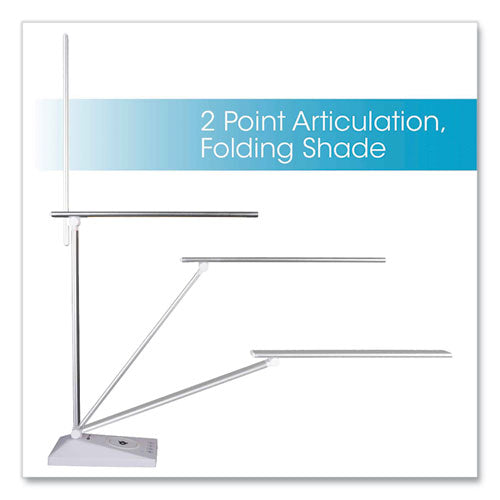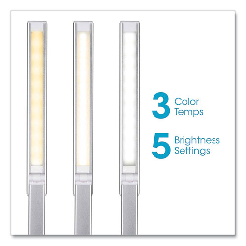 Give your space a total lighting upgrade with the OttLite Entice LED Desk Lamp with Wireless Charging. Part of the OttLite Wellness Series, this feature-packed folding lamp helps reduce eyestrain with next generation ClearSun LED technology, as close to natural daylight as you can get. Also includes two additional color temperature modes (warm white and bright white). Easily adjust the brightness with the up and down buttons. With two points of articulation on the sleek aluminum arm, you can easily place the soothing, low glare illumination right where you need it. And, to keep your devices fully charged use the Qi-wireless charging pad or the 5V, 2.1A USB port.Note: This is a non-returnable item.