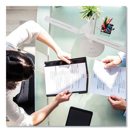 Create a customized lighting setup with this height-adjustable OttLite Pivot LED Desk Lamp with Dual Shades. Exclusive ClearSun LED technology optimizes illumination while helping reduce eyestrain by 51%. A color rendering index of 97 provides this dimmable OttLite pivot dual-shade LED desk lamp with outstanding color accuracy, and the three color modes with touch-activated controls enable easy adjustments.Note: This is a non-returnable item.