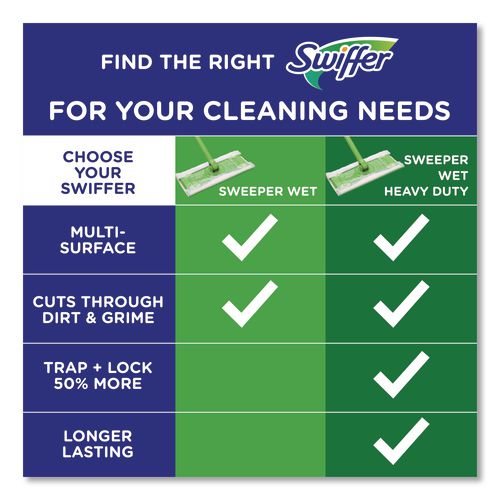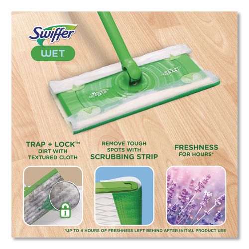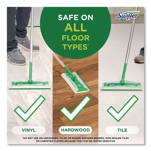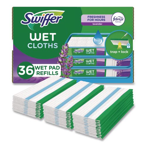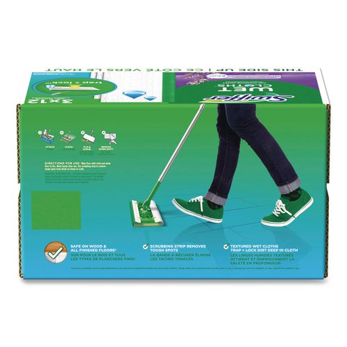 Premoistened cloths for 10" Swiffer sweeper. Wet wipes with a unique cleaning solution work to dissolve tough spots. Convenient disposable wipes remove dirt and grime. Safe for use on linoleum, vinyl, ceramic and finished wood floors. Swipe floors clean and throw wipes away—no rinsing required.
