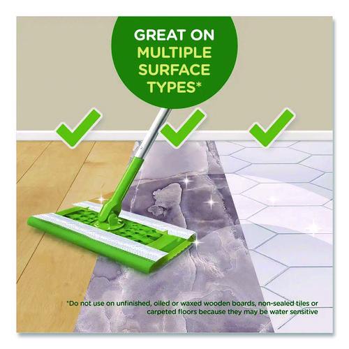Premoistened cloths for 10" Swiffer sweeper. Wet wipes with a unique cleaning solution work to dissolve tough spots. Convenient disposable wipes remove dirt and grime. Safe for use on linoleum, vinyl, ceramic and finished wood floors. Swipe floors clean and throw wipes away—no rinsing required.
