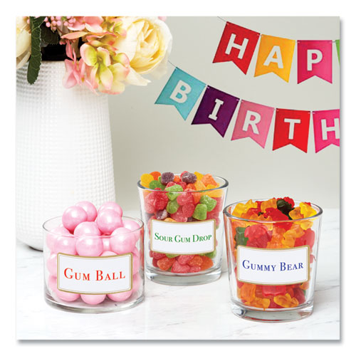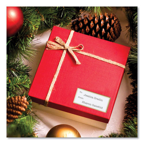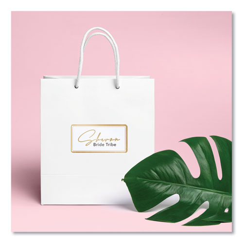 Remarkably reflective and elegant, Avery matte white rectangle labels with metallic gold borders bring a strikingly radiant shine to any event or project. Each rectangle label is pre-printed with a brilliant gold foil-like border that is guaranteed to capture people's attention. Avery Easy Peel technology makes it simple and easy to peel and place multiple labels quickly. Just bend back the label sheet to expose the pop up edges to peel away each label without risking ripping or tearing. Using a strong permanent adhesive, every label can stick and stay to a variety of surfaces including cardboard, envelopes, paper, glass, metal and more. Create beautiful designs and make your own address labels, wedding RSVP labels, party favor labels, product labels, food labels, holiday cards and more using the free design software and templates at avery.com/templates. Compatible with both laser and inkjet printers.