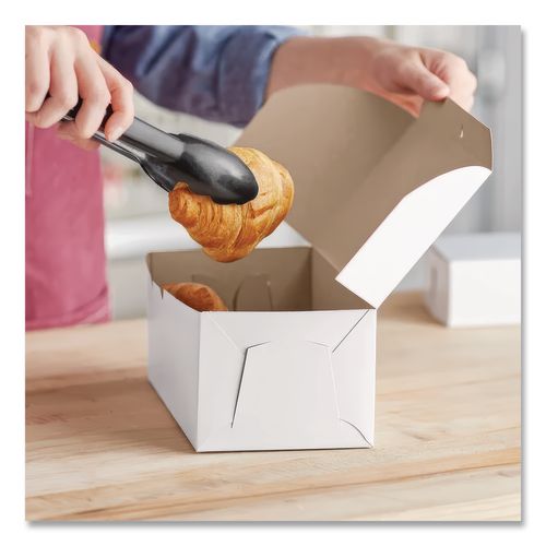 The bakery box is made from high quality paperboard that is white on the outside and Kraft on the inside. Perfect for cakes, pastries, pies and cupcakes. The white, clay-coated exterior accepts a printed logo or business name. Each one-piece box ships flat for transport and storage, but assembles easily into a folded carton with lock-corner closures and a tuck top to secure contents.