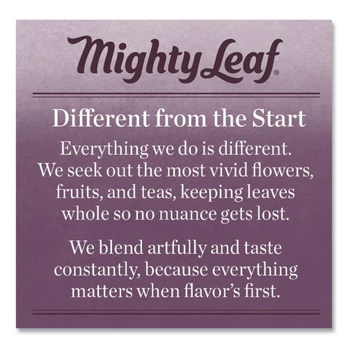 Elevate your tea experience with Mighty Leaf Tea's whole leaf, loose leaf tea pouches. Blends are made from a pure state, using only the top leaves and buds from the tea plant. All teas and ingredients come from artisan tea gardens on every continent. The award winning commercially compostable tea pouches allow leaves to unfurl properly and offer a bold, rich and fragrant cup, beyond a tea drinker's expectations.Note: This is a non-returnable item.