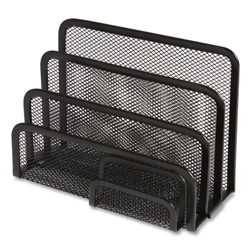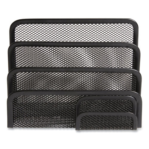 Organize your ingoing and outgoing mail while keeping your business cards within easy reach. Staggered dividers make it easy to keep track of which envelopes go where. Tightly woven metal-mesh body and a sleek, flat-square frame with rounded edges deliver reliable performance with a contemporary, professional flair. Front compartment stores up to 40 standard business cards.