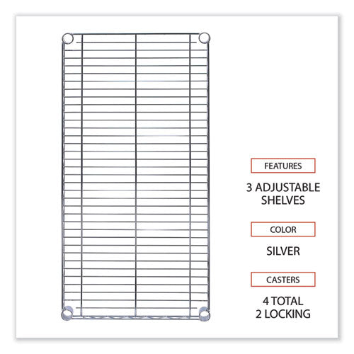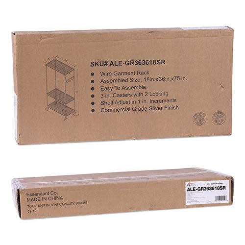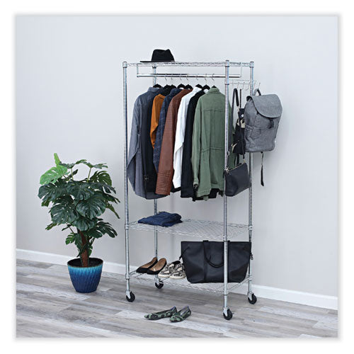 Time-saving design assembles in minutes without tools. Strong welded wire construction that allows air circulation and helps reduce dust buildup. Double-sided for quick access to items. Rack features hanging rod for garments, five support hooks for umbrellas, bags, and other items to accommodate your needs. Three shelves adjust in 1" increments and support 350 lbs. on each shelf. Four casters for quick mobility and two lock when it has reached your destination. Total unit capacity is 500 lbs. if used with casters. Hangers not included.