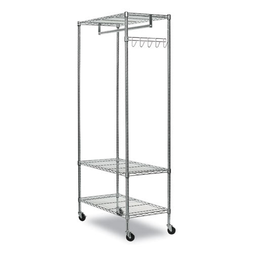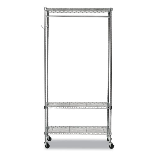 Time-saving design assembles in minutes without tools. Strong welded wire construction that allows air circulation and helps reduce dust buildup. Double-sided for quick access to items. Rack features hanging rod for garments, five support hooks for umbrellas, bags, and other items to accommodate your needs. Three shelves adjust in 1" increments and support 350 lbs. on each shelf. Four casters for quick mobility and two lock when it has reached your destination. Total unit capacity is 500 lbs. if used with casters. Hangers not included.