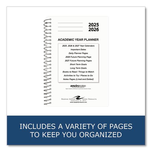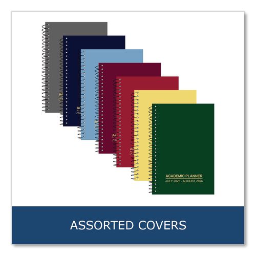 Academic-year planner features a detailed format to help you keep track of your class schedule, notes, grade record, address/phone directory and weekly schedule. Dated planning pages range 14 months from July to August and include two-page-per-week spreads. Each planner contains smooth, 20 lb writing paper. Wire ends are coil-locked for snag-proof storage. Covers are made with 16 point Saranac board for sturdy protection.Note: This is a non-returnable item.