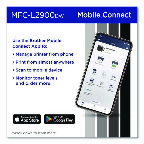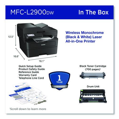 Designed for exceptional efficiency and premium performance, the MFC-L2900DW Wireless Compact Monochrome (Black & White) All-in-One Laser Printer is an affordable choice for business-grade printing, copying, scanning and faxing. Quick and efficient, it consistently produces crisp, easy-to-read black-and-white prints at speeds up to 36 pages per minute (ppm). Powerful time-saving features like single-pass duplex scanning and a 50-page automatic document feeder help you handle large multi-page double-sided copy, scan, and fax jobs with ease. Convenient automatic duplex printing and a 250-sheet paper tray reduce the frequency of paper refills. With an enhanced, highly efficient fuser design, this model offers a 22% reduction in electricity consumption compared to its predecessor. This also means a significantly shorter warmup time from sleep mode, so you can start printing in half the time. Navigation is simple and straightforward with the large integrated 3.5" touchscreen, which allows you to easily print-from and scan-to popular Cloud-based apps. Flexible connection options include dual-band wireless, Ethernet and USB 2.0. Advanced security features offer peace-of-mind to help safeguard information and maintain secure connections while printing. Streamlining four critical business functions into one compact footprint, this multi-function wireless printer is an efficient, time-saving addition to any workspace.Package Includes: Starter Black Toner Cartridge; DR830 Drum Unit; AC Power Cord; Product Safety Guide; Quick Setup Guide; Reference Guide; Telephone Line Cord; Warranty Card