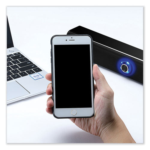 Our 20 W Wireless Desktop Soundbar Speakers are a nice upgrade for the home or office. They connect Wirelessly to Bluetooth®-enabled devices or to a standard USB port to provide dynamic stereo sound for your workspace. Connect via Bluetooth® or simply plug the USB adapter cable into your computer and our plug-and-play design is ready to use. Position the Soundbar under your monitor, creating a 3D sound stage to listen to your music or stream and watch your favorite movies. The speakers have a built-in sound chip, allowing direct plug-and-play with a simple USB connection and eliminating the need for a separate audio connection. Delivers clear and crisp stereo sound.Package Includes: Users Manual; Warranty Information