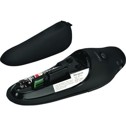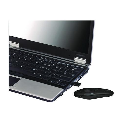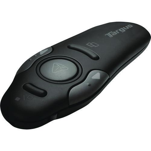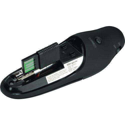 Wireless presenter with laser pointer makes it easy to control your presentation from up to 50 ft away. The ergonomic design with soft touch surface makes it easy to hold the device in your hand and navigate through the buttons comfortably. The built-in laser pointer allows you to highlight key points while the other keys allow you to page up, page down, exit/resume presentation mode, and darken screen. The preset RF connection enables true plug-and-play capability; no driver is required.Package Includes: Mini USB Receiver; (1) AAA Battery; User Guide