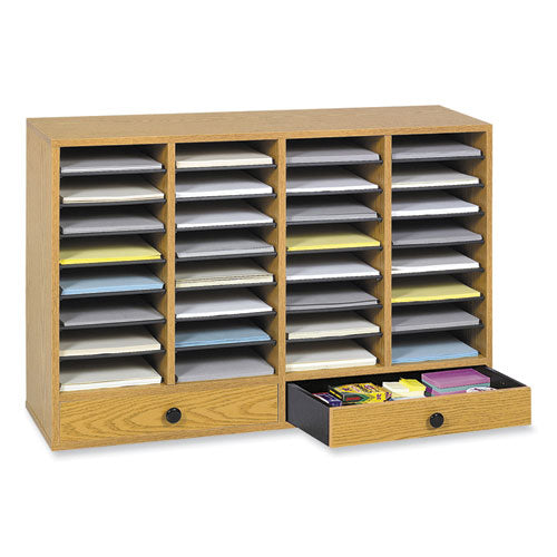 The Wood Adjustable Literature Organizer is a organizer with 32 adjustable storage compartments and two drawers. These sorters offer literature organization, supply storage and more. Built from compressed wood with laminate finish and solid fiberboard back. The literature organizer's hardboard shelves form convenient letter-size compartments or can be reconfigured for larger items. Offers black plastic molding and labeling area. Can be stacked up to three high.Note: This is a non-returnable item.