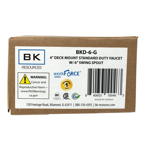 The Workforce Standard Duty Faucet with Spout and Mount is a reliable choice, featuring 1/4 turn ceramic cartridges for smooth and efficient operation. Notably, this faucet is lead-free, prioritizing safety. It complies with ANSI/NSF 61 and cCSAus standards, ensuring that it meets industry-approved quality and safety measures. With its combination of functionality and adherence to standards, this standard duty faucet is suitable for various applications where reliability and compliance are key considerations.Note: This is a non-returnable item.
