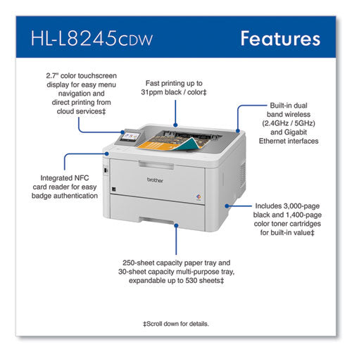 The Brother Workhorse HL-L8245CDW digital color printer is a great choice for small businesses, busy offices, and small workgroups that need cost-efficient, high-quality color output, versatile paper handling, and advanced security features. This compact printer helps to increase productivity with fast print speeds up to 31 ppm. Delivers cost-efficient printing by using the Brother Genuine TN229XXL super high-yield replacement toner cartridges. Triple Layer Security features help to limit document and device access and protect against network intrusions. Offers versatile paper handling with a 250-sheet capacity paper tray that is expandable with an optional tray. The 2.7" color touchscreen display enables direct printing from cloud services. The HL-L8245CDW also provides flexible connectivity with built-in Gigabit Ethernet and dual band wireless networking or connect to a single computer via USB interface. Print vivid color and sharp black documents from virtually anywhere with mobile device printing.Package Includes: Black, Cyan, Magenta, and Yellow Starter Toner Cartridges; DR229CL Drum Unit; BU229CL Belt Unit; WT229CL Waste Toner Box; AC Power Cord; Product Safety Guide; Reference Guide; Warranty Card; Quick Setup Guide