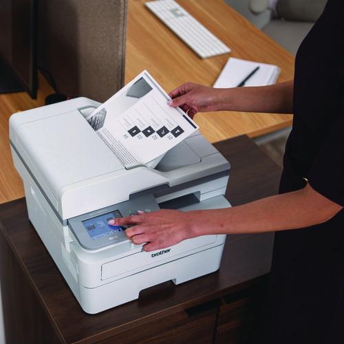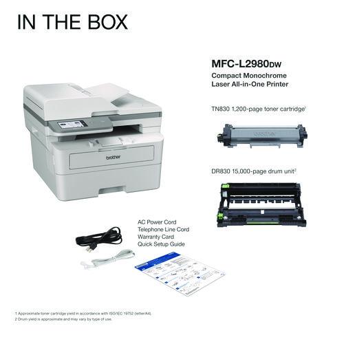 Brother Workhorse MFC-L2980DW Compact Monochrome Laser All-in-One Printer provides the functionality needed for small offices and small workgroups. Helps to increase productivity with a fast print speed of up to 36 ppm. Scan-to popular cloud destinations directly from the 3.5" color touchscreen display. Offers a 250-sheet capacity paper tray that is adjustable for letter or legal-sized paper. Delivers cost-efficient output by using the Brother Genuine TN835 super high yield replacement toner cartridge. Built-in wireless and Ethernet network interfaces are easy to set up and share on a wireless or wired network. Wirelessly print from and scan to mobile devices.Package Includes: AC Power Cord; DR830 Drum Unit; Quick Setup Guide; Telephone Line Cord; TN830 Black Toner Cartridge; Warranty Card