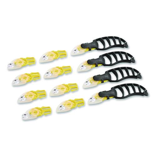 Developed as a safe alternative to replacement blades used with standard utility knives, and to minimize the costs associated with medical, legal and lost time from employee and consumer injuries caused by loose blades in the workplace. Uses a spring activated blade guard to protect users by closing after each cut. Kit includes four assembled knives and eight replacement blade cartridges.Package Includes: (4) Assembled Knives; (8) Replacement Blade Cartridges