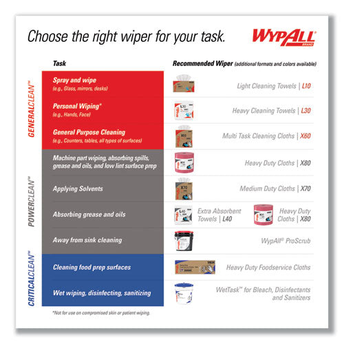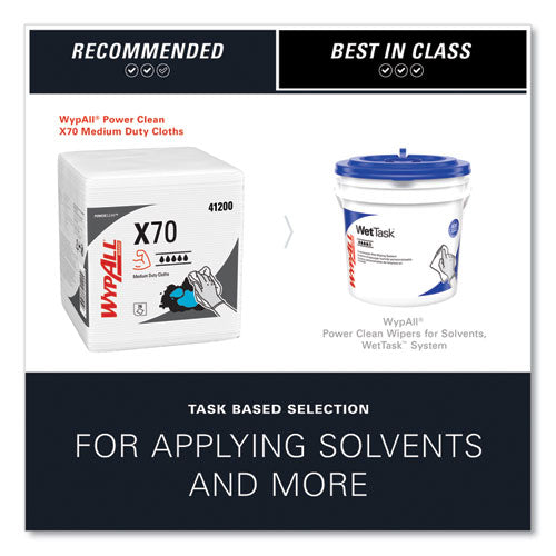 WypAll® is the number one brand of disposable wipes in the US and Canada. Maximize performance while minimizing time, effort and product waste. If you've been using either laundered shop towels or textile shop rags, it's time to make the switch to WypAll® PowerClean™ X70 Cloths. The cloths are durable, absorbent industrial cloths featuring high-tech Hydroknit® material. WypAll® X70 cloths now absorb up to 20% more oil and water than before. In addition, Theys now feature a new cloth-like look and feel for enhanced absorbency, making them even more effective for your cleaning tasks. These medium duty cloths are made of soft pulp fibers, bonded to a polypropylene base sheet for absorbency and tear resistance, making them suitable for removing dirt, oil, grime and solvents in a variety of industrial and manufacturing industries. WypAll® X70 cloths are so sturdy that they can often be used more than once. (Once you've used them a few times, they're disposable.) These premium industrial cleaning cloths are designed to clean surfaces and tools, making them a must-have for the HVAC, automotive, manufacturing and industrial industries. When you're running a business, it pays to use the very best supplies. Trust the performance and innovation of WypAll® PowerClean™ X70 Medium Duty Cloths today.