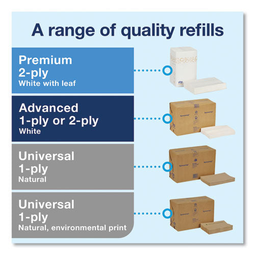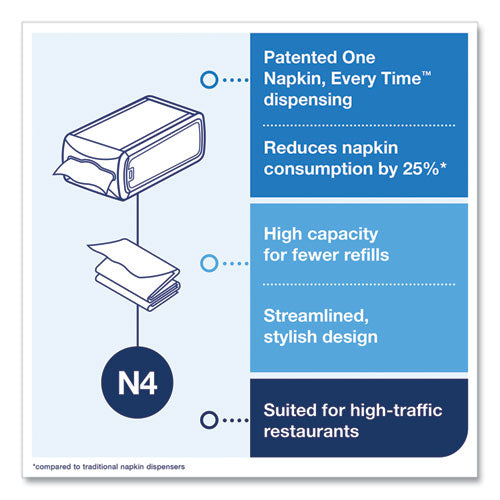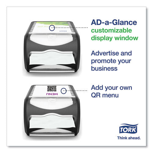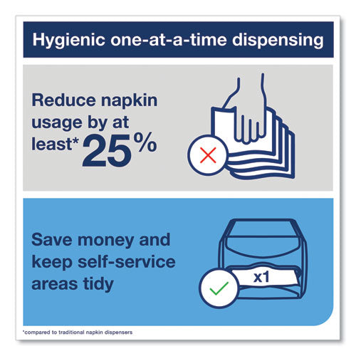 The Tork Xpressnap® Counter Napkin Dispenser is the ideal for limited service restaurants that offer napkins at a central location. This modern dispenser delivers napkins one-at-a-time, improving hygiene and reducing napkin consumption by at least 25%, when compared to traditional dispenser napkins systems. Versatile design, can be positioned vertically or horizontally for added flexibility where countertop space is limited; AD-A-Glance® customizable display window serves as an advertising tool to promote your products and engage with your guests.