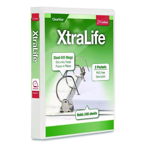 Cardinal® XtraLife® ClearVue™ Binders withstand frigid temperatures. Even in extremely cold weather, covers are guaranteed not to split or tear for three years. Slant-D® rings with nickel triggers hold 25% more sheets than standard round rings. Binders feature ClearVue™ covers for a customized front, back and spine. PVC free.