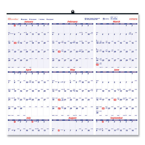 Attractive wall calendar delivers a full year of planning on a single sheet. Delineated quarters in a contrasting, two-tone print design make it easy to track the year's progress in a meaningful way. Laid out in a four rows by three columns format, each full month is fully accounted for with unruled daily blocks, standard dates as well as a countdown of days past and days to come. All major holidays are also labeled and highlighted. Heavyweight paper stock provides excellent ink-bleed resistance. Metal eyelet at top and metal support frames running along the top and bottom edges help ensure that the calendar hangs properly on your chosen wall.Note: This is a non-returnable item.