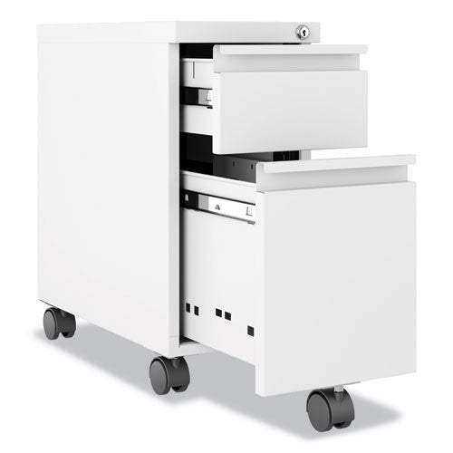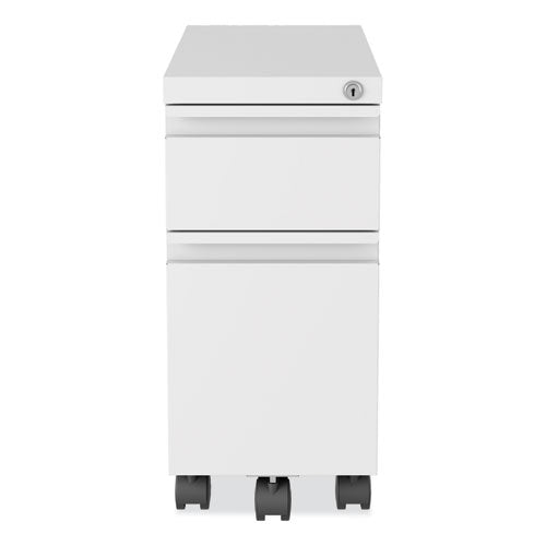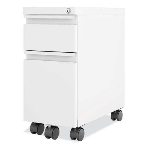 Compact alternative to standard pedestal files. The narrow design works great for smaller desks. Holds essential workstation supplies in the box drawer. File drawer holds letter or legal size hanging file folders. Durable, fully assembled steel construction with non-porous surface is easy to clean. Lightweight design makes it easy to roll around. Includes a fifth swivel caster for stability eliminating the need for counterweights.Note: This is a non-returnable item.