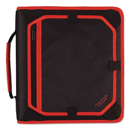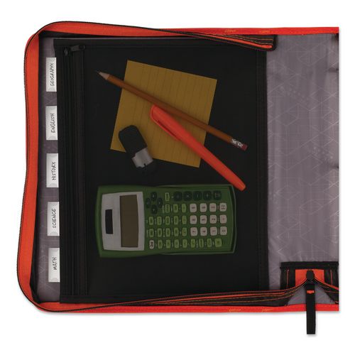 Durable design easily stands up to daily wear and tear, making it a great choice for busy students. An exterior expansion panel lets you store textbooks and notebooks without needing to unzip the binder to access them. Inside the binder are three rings that hold 380 sheets and a five-pocket expanding file that holds an additional 200 sheets. A great choice for school, this binder includes three exterior pen loops and an exterior zipper pocket to keep small items stored and accessible. Includes a gusseted pocket with a Velcro closure, perfectly sized to fit a calculator and a micro mesh interior pocket with a zipper closure to view and store smaller supplies. Binder has a full zipper closure and carrying handle so you can easily take it with you throughout the day.